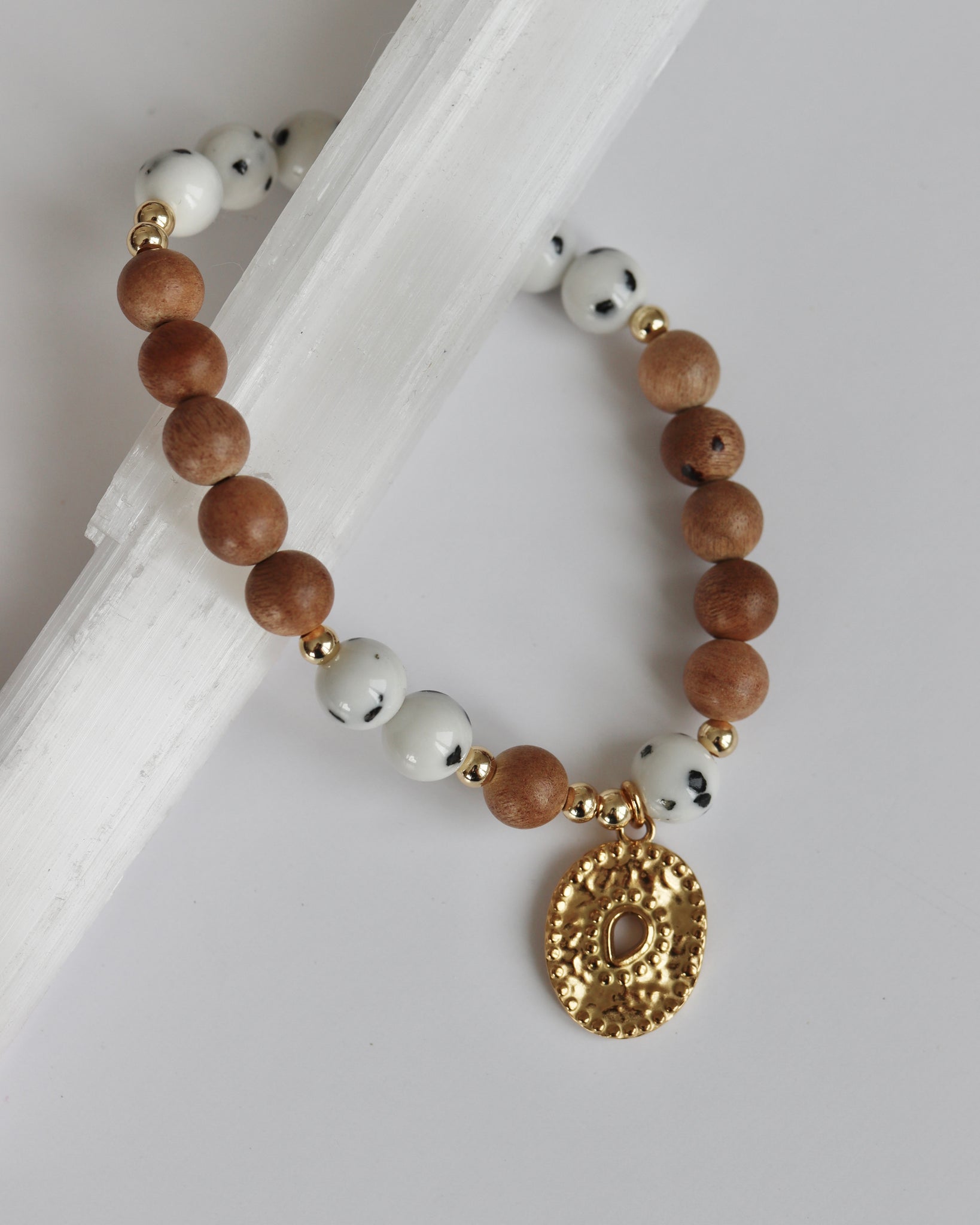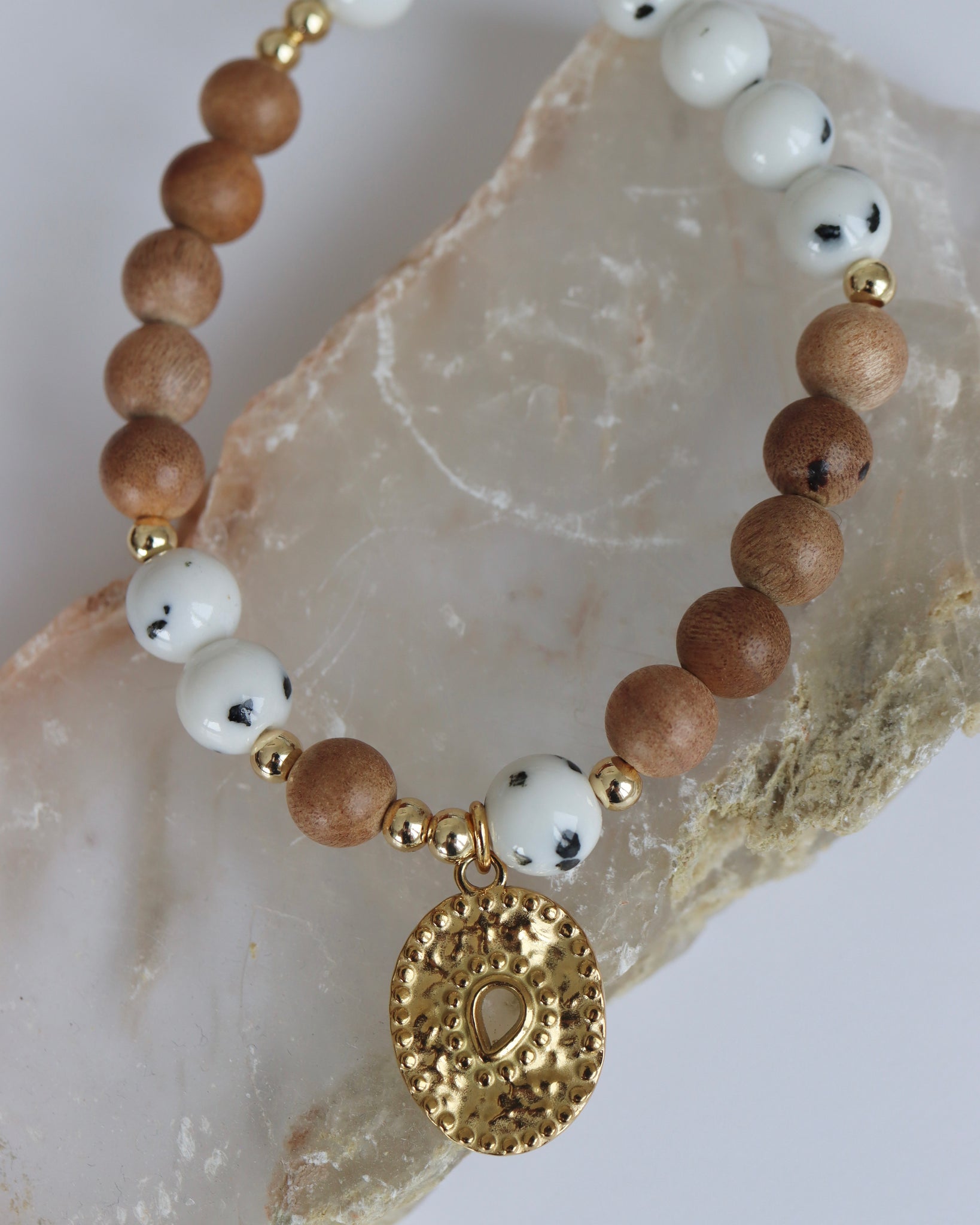 Ce bracelet est composé de billes de bois et de pierres Dalmatian, reconnues pour leurs petites inclusions noires uniques qui rendent chaque pièce différente et authentique.