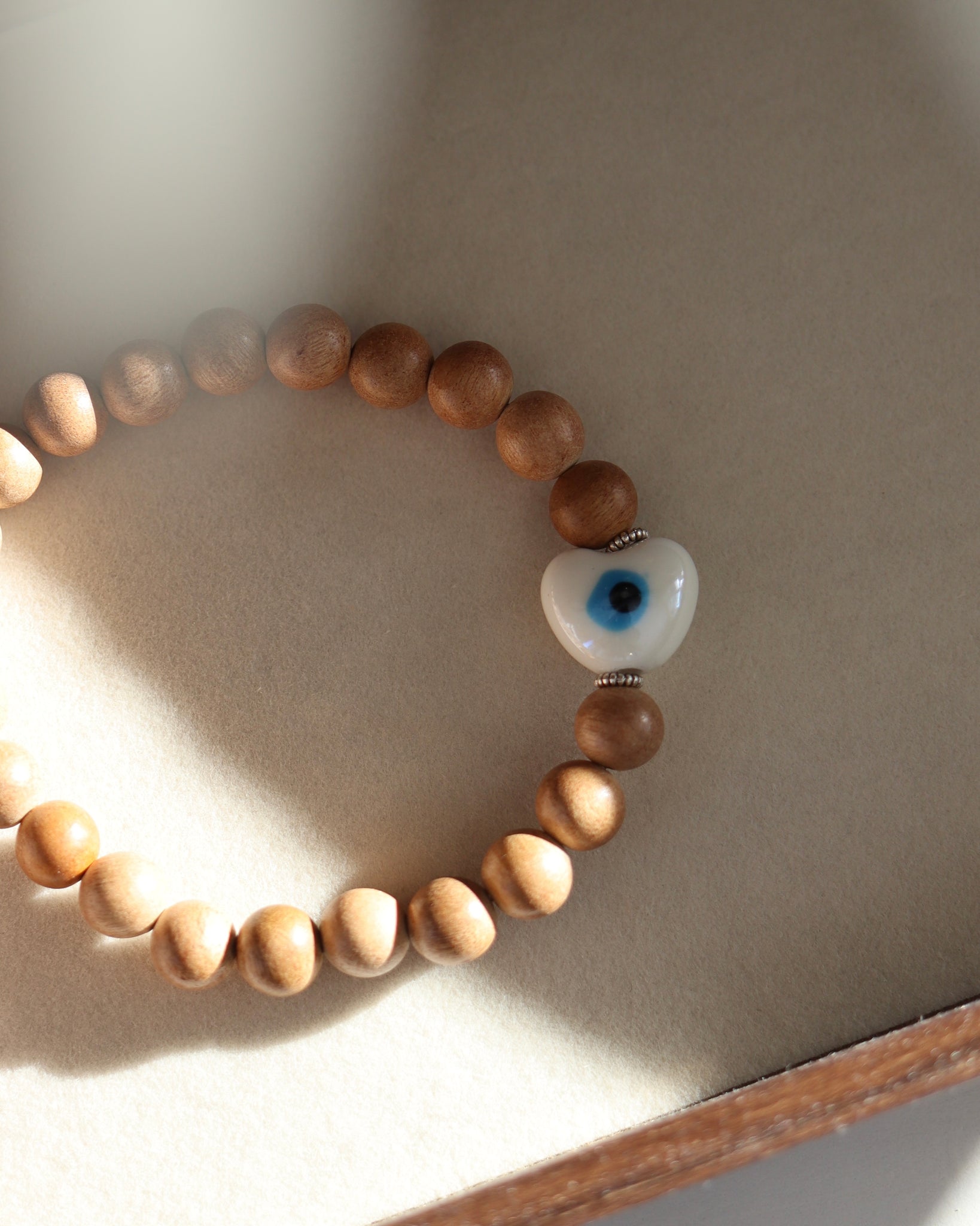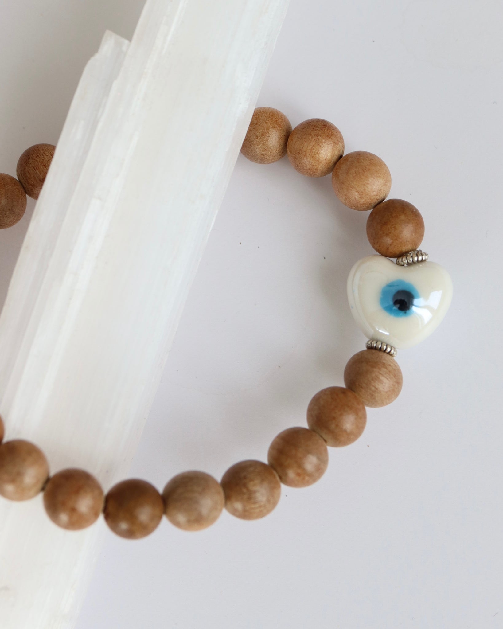 Collier en billes de bois et cœur en céramique – Œil protecteur